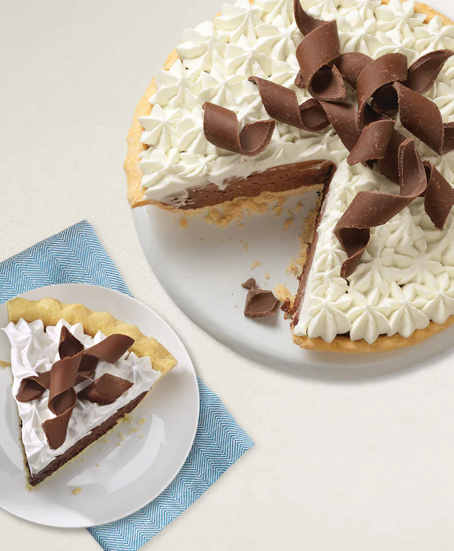 Velvety smooth chocolate silk covered with real whipped cream and milk chocolate curls, inside an award-winning pastry crust.